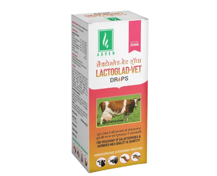 Adven Lactoglad Vet Drops are a specially formulated veterinary supplement designed to support and enhance milk production in farm animals such as cows, buffaloes, and goats. This herbal remedy is ideal for animals experiencing low milk yield, poor lactation, or post-calving weakness. Adven Lactoglad Vet Drops helps stimulate natural milk flow while maintaining udder health and overall vitality. Trusted by veterinarians, this Adven Lactoglad Vet Drops gentle formulation ensures safe and effective lactation support without harmful side effects.