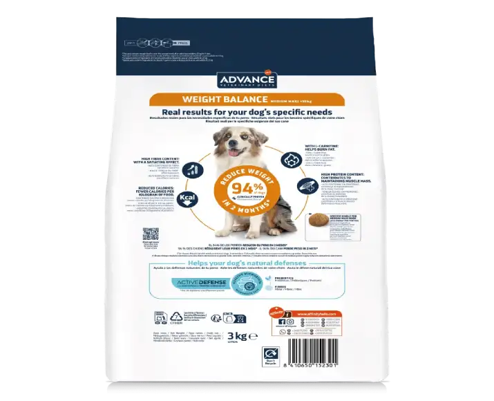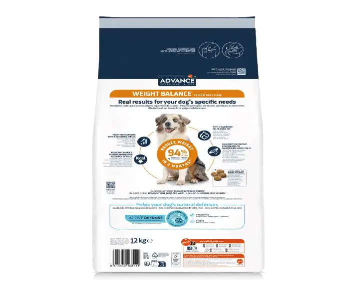 Affinity Advance Weight Balance Medium & Maxi Veterinary Dog Dry Food is a premium, vet-recommended diet designed specifically for dogs prone to weight gain, tailored for medium and large breed dogs, this complete diet helps manage body weight while maintaining muscle tone and overall well-being, Affinity Advance Weight Balance Medium & Maxi Veterinary Dog Dry Food provides balanced nutrition with reduced fat content, Affinity Advance Weight Balance Medium & Maxi Veterinary Dog Dry Food making it ideal for dogs with lower activity levels, post-neutering changes, or those under a controlled weight management plan.