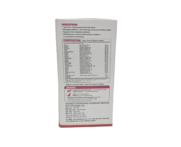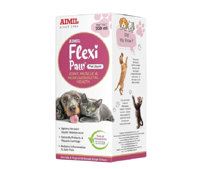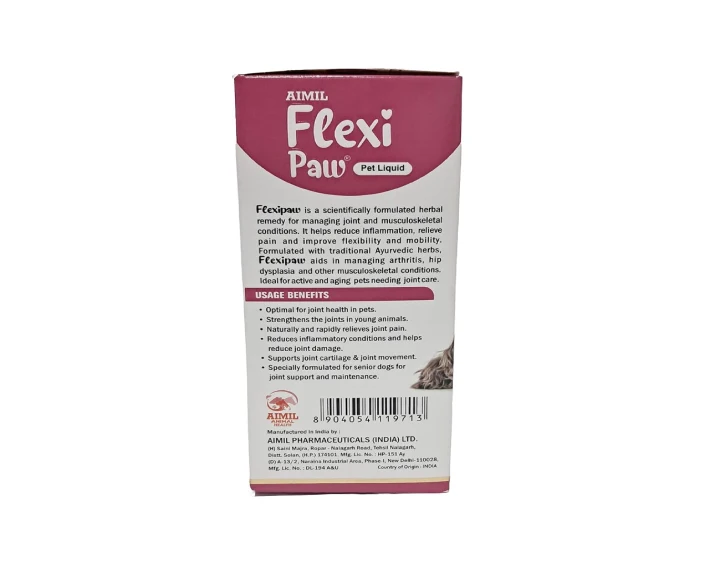Aimil Flexipaw Pet Liquid, Herbal Joint & Hip Support is a specially formulated herbal supplement designed to support joint health, flexibility, and mobility in dogs & cats. Ideal for aging pets, active breeds, or those experiencing joint discomfort, this Aimil Flexipaw Pet Liquid, Herbal Joint & Hip Support formulation combines traditional herbal wisdom with modern veterinary care. Joint problems such as stiffness, reduced mobility, and hip discomfort can affect your pet’s quality of life. Aimil Flexipaw Pet Liquid, Herbal Joint & Hip Support helps address these issues naturally by promoting cartilage health and reducing inflammation. Its easy-to-administer liquid form ensures better absorption and convenience for pet parents.