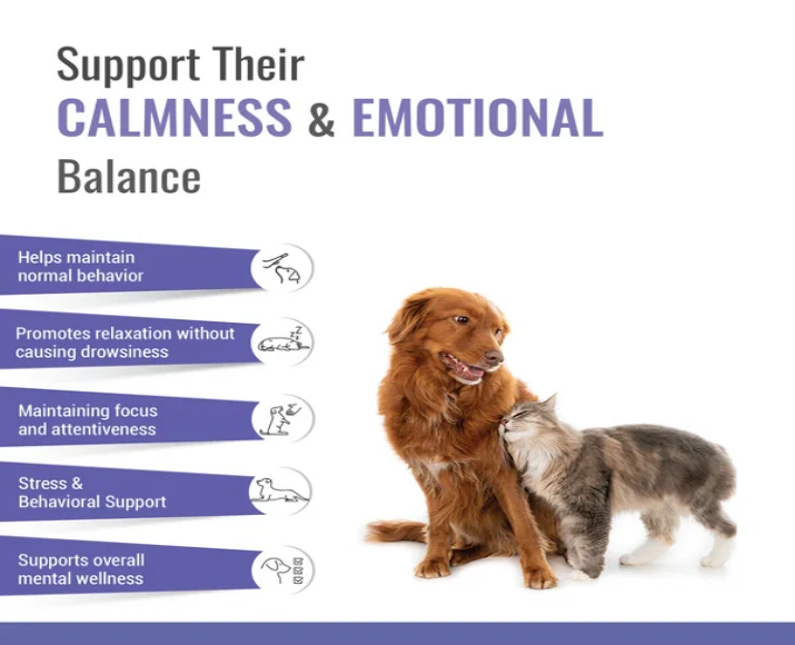Supports emotional stability, making pets calmer during stressful situations like vet visits, travel, or thunderstorms. -