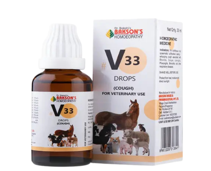 Bakson Veterinary V33 Cough Drops are specially formulated homeopathic veterinary drops designed to support farm animals suffering from persistent cough, throat irritation, and respiratory discomfort, whether caused by environmental changes, dust, or mild infections, these Bakson Veterinary V33 Cough Drops provide natural, gentle, and effective relief without harsh side effects, trusted by veterinarians, this 30ml pack is suitable for cattle, goats, sheep, and other farm animals that require respiratory care.