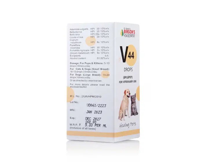 Bakson Veterinary V44 Epilepsy Drops are specially formulated homeopathic drops designed to provide safe and gentle relief from seizures and epilepsy in cats & dogs, this natural veterinary solution is suitable for pets suffering from nervous system disorders, recurrent convulsions, or seizure-related discomfort, Bakson Veterinary V44 Epilepsy Drops ideal for pet parents seeking a trusted, non-toxic alternative, these drops promote overall neurological balance and calmness in pets.
