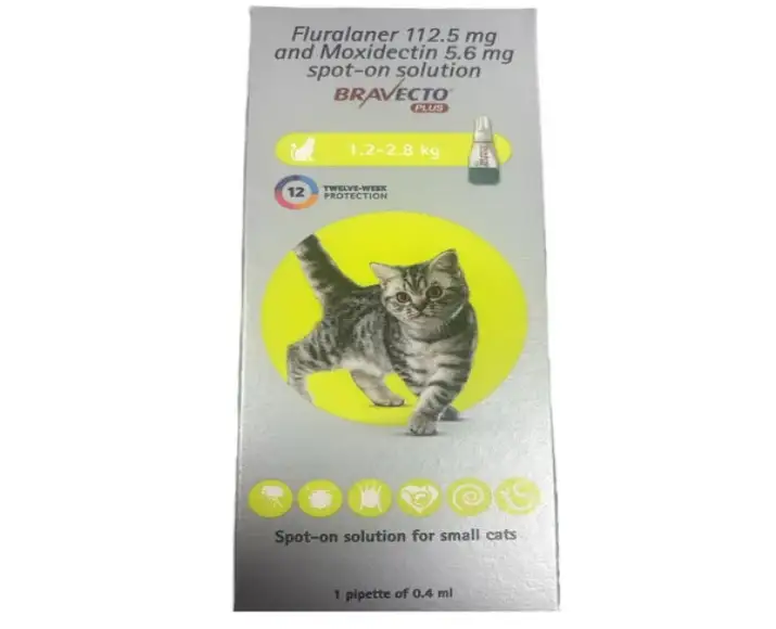 | 1.2 – 2.8 kg | Bravecto Cat 112.5 MG | One full pipette | Every 12 weeks for fleas / 8 weeks for ticks |