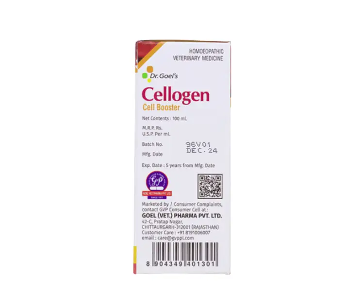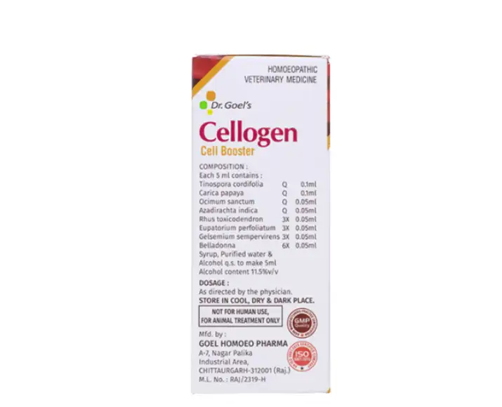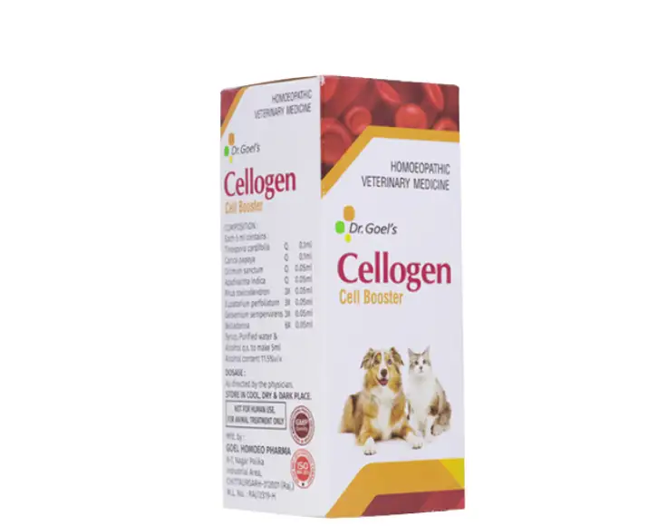 Dr Goel CELLOGEN Cell Booster is a veterinary-formulated liquid supplement designed to support cellular health, immunity, and overall vitality in pets, suitable for pets of all ages, this Dr Goel CELLOGEN Cell Booster advanced cell-support formula helps the body recover from illness, stress, surgery, and nutritional deficiencies by promoting healthy cell regeneration and metabolic balance, pets often experience weakness due to infections, chronic conditions, aging, or post-treatment recovery, Dr Goel CELLOGEN Cell Booster is specifically developed to address these challenges by nourishing cells at a foundational level, this Dr Goel CELLOGEN Cell Booster easy-to-administer liquid is ideal for pets that are lethargic, have low appetite, or need additional support during growth, recovery, or aging.