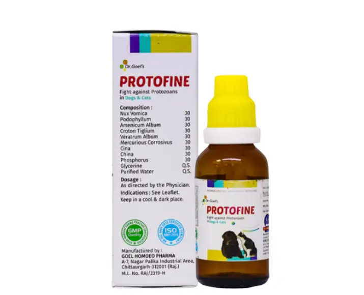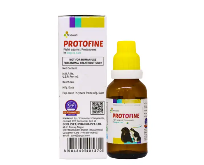 Dr Goel PROTOFINE Fight against Protozoans is a veterinary-recommended oral liquid formulated to support dogs & cats affected by protozoan infections, protozoans are microscopic parasites that commonly impact the digestive system, often leading to symptoms such as diarrhea, dehydration, weakness, and reduced appetite, Dr Goel PROTOFINE Fight against Protozoans is designed to help manage these conditions as part of a veterinarian-guided treatment plan making it suitable for both puppies, kittens, and adult pets, Dr Goel PROTOFINE Fight against Protozoans liquid form ensures easy administration and better compliance, especially for pets recovering from gastrointestinal stress, this Dr Goel PROTOFINE Fight against Protozoans product is intended for pet parents seeking a trusted, supportive solution that complements prescribed veterinary care and promotes overall digestive balance in dogs and cats.