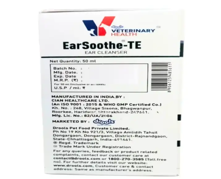 Drools Earsoothe TE Ear Cleanser is a specially formulated veterinary ear hygiene solution designed to support clean, healthy ears in both dogs & cats, regular ear cleaning is essential for pets prone to wax buildup, unpleasant odor, itching, or recurrent ear discomfort, this Drools Earsoothe TE Ear Cleanser gentle yet effective cleanser helps dissolve excess wax, remove trapped debris, and soothe sensitive ear canals without causing irritation, Suitable for routine use as well as supportive care during ear treatment protocols, Drools Earsoothe TE Ear Cleanser is ideal for pets with floppy ears, active outdoor lifestyles, or breeds known to experience frequent ear issues the formula is non-stinging, pet-friendly, and easy to apply, Drools Earsoothe TE Ear Cleanser making ear care stress-free for both pets and pet parents.
