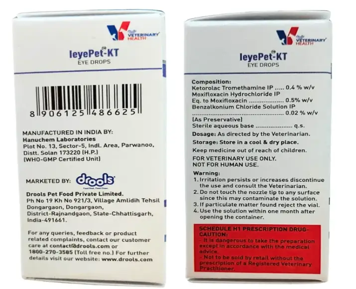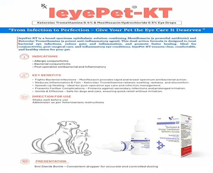 Drools LeyePet KT Eye Drops are a veterinary-recommended ophthalmic solution specially formulated to manage eye inflammation, irritation, & discomfort in dogs & cats, eye problems in pets can arise from infections, allergies, dust exposure, or minor injuries, often causing redness, swelling, and excessive tearing, this Drools LeyePet KT Eye Drops gentle yet effective eye drop helps soothe inflamed tissues while supporting faster recovery and improved eye comfort, designed for routine and prescribed use, Drools LeyePet KT Eye Drops are suitable for both dogs & cats of all breeds and life stages, the formulation is crafted to be safe for sensitive pet eyes and easy for pet parents to administer at home under veterinary guidance Drools LeyePet KT Eye Drops making it a dependable choice for everyday eye care needs.