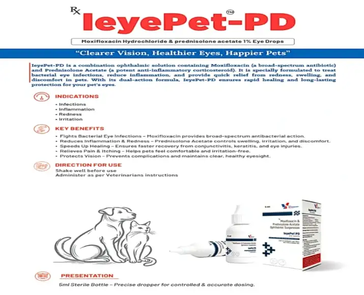 Drools LeyePet PD Eye Drops are specially formulated ophthalmic drops designed to support eye health in dogs & cats, this Drools LeyePet PD Eye Drops vet-recommended solution helps manage common eye problems such as redness, irritation, discharge, & mild infections, Drools LeyePet PD Eye Drops suitable for regular use under veterinary guidance, it provides gentle yet effective care for sensitive pet eyes, crafted with pet safety in mind, Drools LeyePet PD Eye Drops are ideal for pet parents seeking reliable daily eye hygiene and comfort for their furry companions formulated to be safe, soothing, and effective.