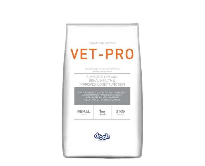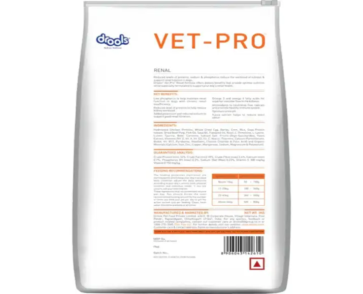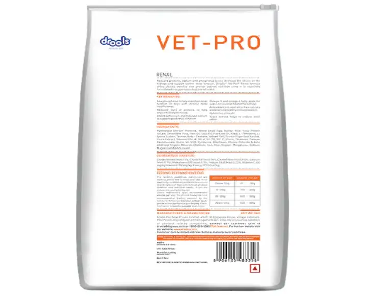 Drools VET PRO Renal Adult Dog Dry Food is a specially formulated veterinary diet designed to support adult dogs with kidney-related concerns, renal health is crucial for maintaining a dog’s overall well-being, energy levels, and longevity, this food is crafted with carefully selected ingredients that reduce the workload on the kidneys while still meeting the essential nutritional needs of adult dogs, developed with veterinary expertise, this diet provides high-quality proteins, controlled phosphorus levels, and antioxidants, Drools VET PRO Renal Adult Dog Dry Food ensuring your furry friend enjoys both taste and therapeutic benefits, whether your dog has been diagnosed with renal insufficiency or requires a kidney-support diet, Drools VET PRO Renal Adult Dog Dry Food offers complete and balanced nutrition you can trust.