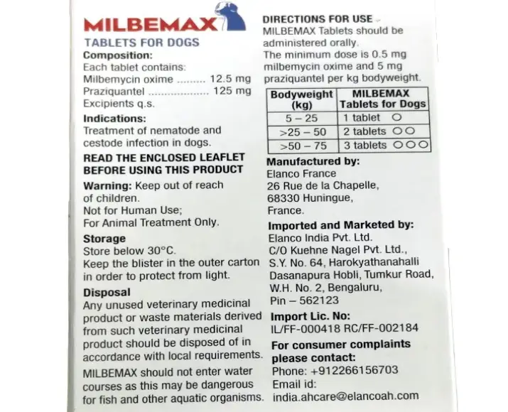 Dosage Chart & Instructions for Elanco Milbemax Tablet For Dogs