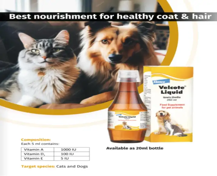 Elanco Velcote Liquid, Omega Enriched Multivitamin is a premium omega-enriched multivitamin supplement formulated for both dogs & cats. Designed to support skin health, coat shine, immunity, and overall wellness, this Elanco Velcote Liquid, Omega Enriched Multivitamin supplement is ideal for pets experiencing dull coats, excessive shedding, nutritional deficiencies, or general weakness.
