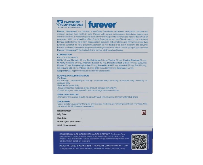 Furever Liverassure Capsules for dogs & cats are specially formulated to support healthy liver function, promote detoxification, and enhance metabolic activity in pets of all ages, the liver plays a crucial role in filtering toxins, aiding digestion, and supporting overall vitality, when this vital organ is compromised, pets may experience low energy, poor appetite, digestive issues, or general weakness, Furever Liverassure Capsules offer a reliable, vet-trusted solution designed for pet parents seeking a safe and effective supplement to maintain or restore liver health, whether your dog or cat requires routine liver support, recovery assistance, or long-term maintenance, this Furever Liverassure Capsules supplement provides targeted nourishment that helps protect and strengthen the liver naturally.