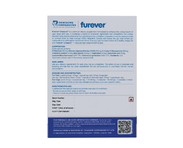 Urinary discomfort is a common issue among both dogs and cats, often caused by infections, bladder irritation, or mineral imbalance, Furever Uriassure Capsules are specially formulated to support urinary tract health, bladder function, and overall comfort in pets of all ages, this Furever Uriassure Capsules supplement is ideal for pets prone to recurring urinary concerns, pets requiring bladder support, senior pets with weakened urinary systems, and cats or dogs experiencing stress-related urinary problems, with its gentle yet effective formulation, Furever Uriassure Capsules provides daily care that helps maintain balanced urine pH, supports kidney function, and promotes a healthier urinary environment, Furever Uriassure Capsules pet parents looking for a reliable, science-backed supplement appreciate its vet-recommended ingredients and easy-to-administer capsule form.