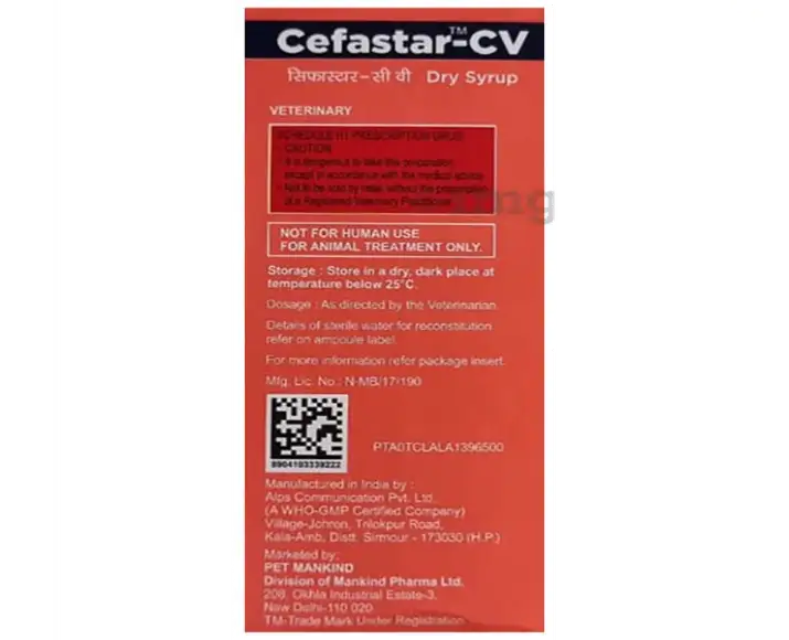 Mankind Cefastar CV Dry Syrup veterinarians commonly prescribe this oral antibiotic for pets suffering from skin infections, respiratory infections, urinary tract infections, and soft tissue infections. The addition of clavulanate enhances the antibacterial action by preventing bacteria from developing resistance, Mankind Cefastar CV Dry Syrup making the medication highly effective in difficult infections.