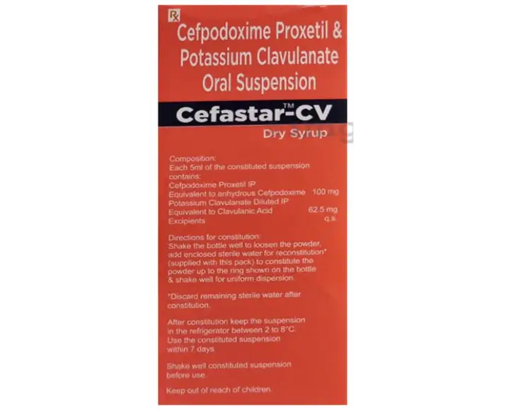 Mankind Cefastar CV Dry Syrup is a veterinary antibiotic formulation designed to treat a wide range of bacterial infections in dogs & cats. It contains a combination of Cefpodoxime Proxetil and Clavulanate Potassium, which work together to fight infection-causing bacteria and improve the effectiveness of treatment.