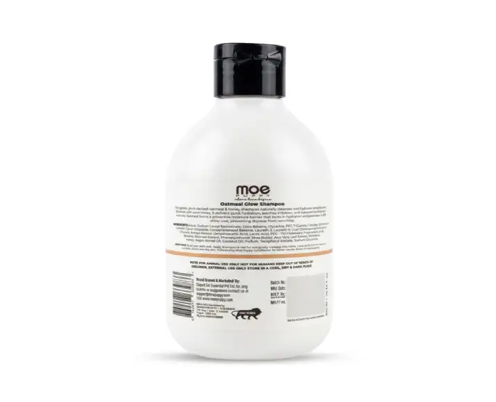Moe Puppy Oatmeal Glow Shampoo is a premium grooming solution designed for both dogs & cats. Enriched with the natural goodness of oatmeal and honey, this Moe Puppy Oatmeal Glow Shampoo provides deep cleansing while maintaining the skin’s natural moisture balance. It is ideal for pet parents looking to improve coat shine, reduce dryness, and keep their pet’s skin healthy and irritation-free. Moe Puppy Oatmeal Glow Shampoo suitable for all breeds and coat types, this gentle formulation ensures a safe and soothing bathing experience for regular use.