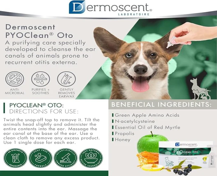 This Savavet Dermoscent Pyoclean Oto Ear Cleanser advanced ear cleanser supports routine ear hygiene and helps manage conditions such as otitis externa, bacterial buildup, and debris accumulation. Savavet Dermoscent Pyoclean Oto Ear Cleanser is suitable for both preventive care and as part of a veterinarian-recommended ear treatment plan.