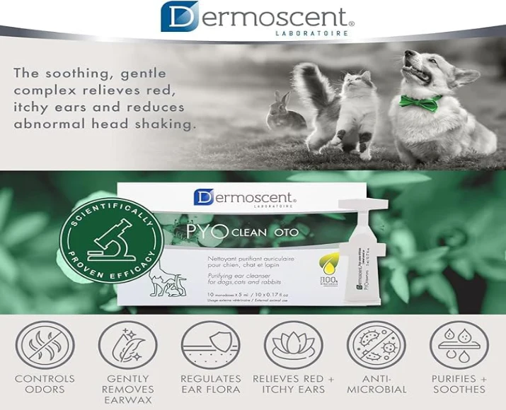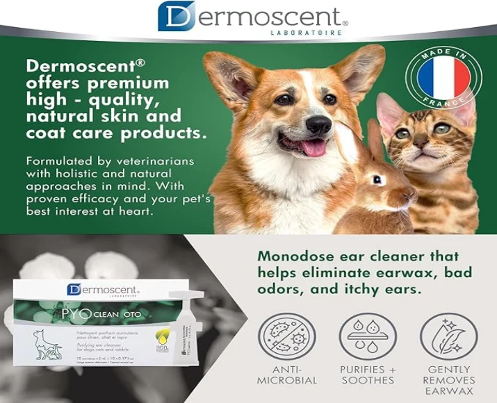 Savavet Dermoscent Pyoclean Oto Ear Cleanser is a specially formulated ear hygiene solution designed for dogs and cats suffering from ear infections, excess wax, bad odor, or irritation. Packed in convenient single-use 5 ml pipettes (10 per box), it ensures precise dosing and hygienic application.