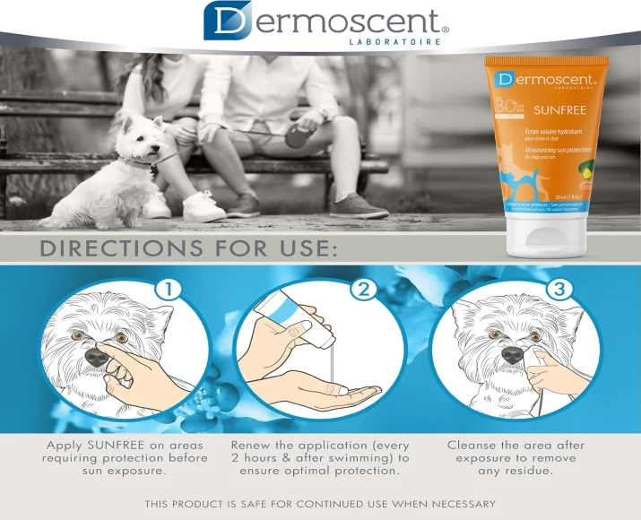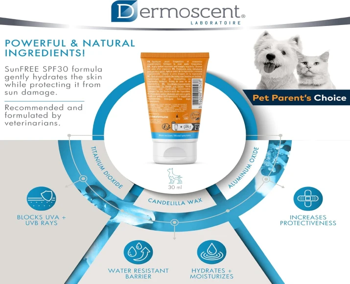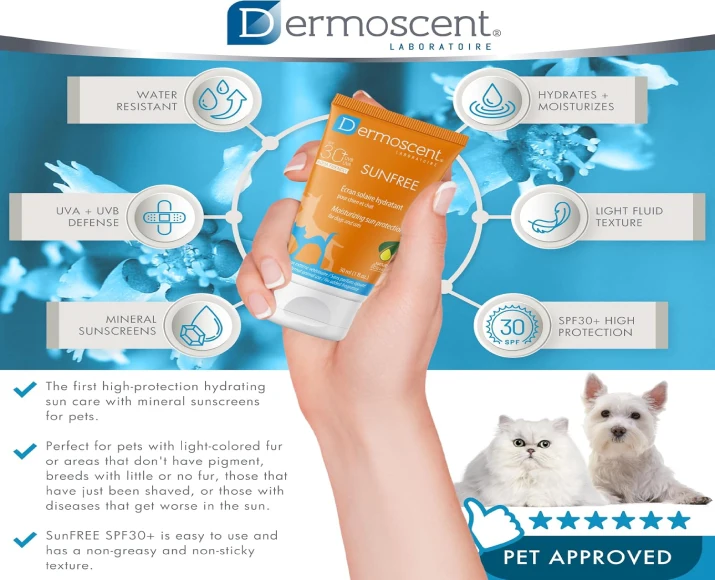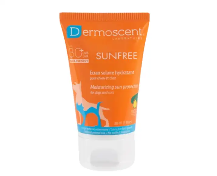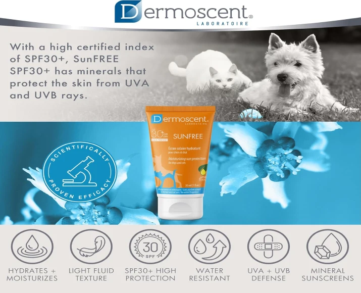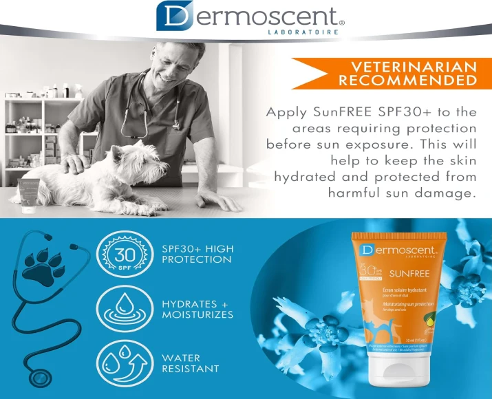 Savavet Dermoscent Sunfree Sun Protection is a specially formulated sun protection lotion designed for dogs & cats exposed to direct sunlight. Just like humans, pets can suffer from sunburn, skin irritation, and long-term UV damage—especially those with light-colored, thin, or hairless coats.