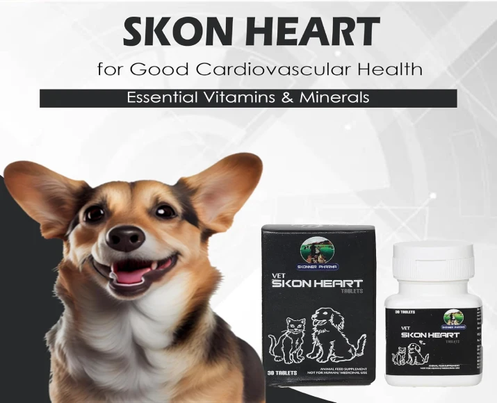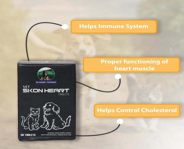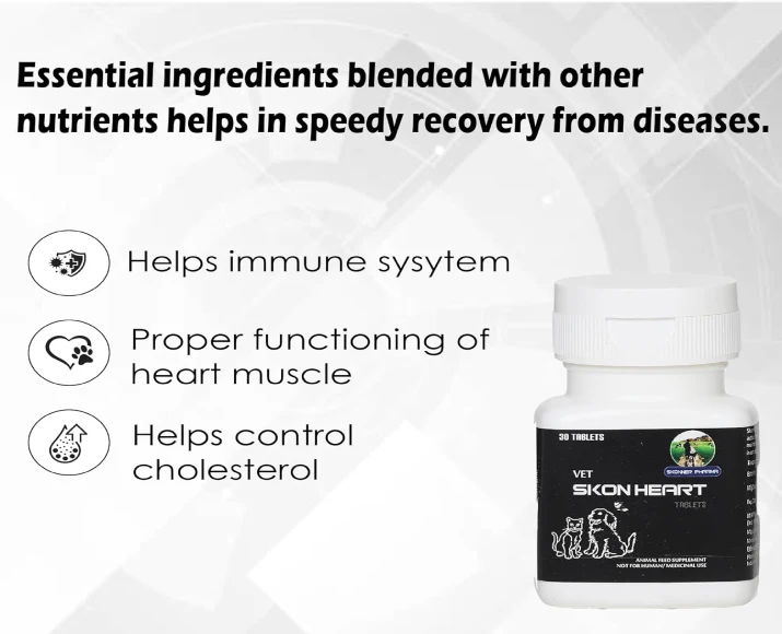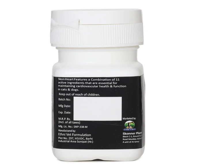 Skonner Pharma Skon Heart for Cardiovascular Care is a specially formulated cardiovascular support supplement designed for dogs suffering from heart-related concerns or those needing preventive cardiac care. It helps maintain optimal heart function, supports healthy blood circulation, and promotes overall vitality. Skonner Pharma Skon Heart for Cardiovascular Care ideal for aging dogs, breeds prone to cardiac issues, or pets recovering from heart-related conditions, this supplement is crafted with carefully selected ingredients that work synergistically to enhance cardiovascular strength. With regular use, it contributes to improved endurance, Skonner Pharma Skon Heart for Cardiovascular Care reduced fatigue, and better quality of life for your pet.