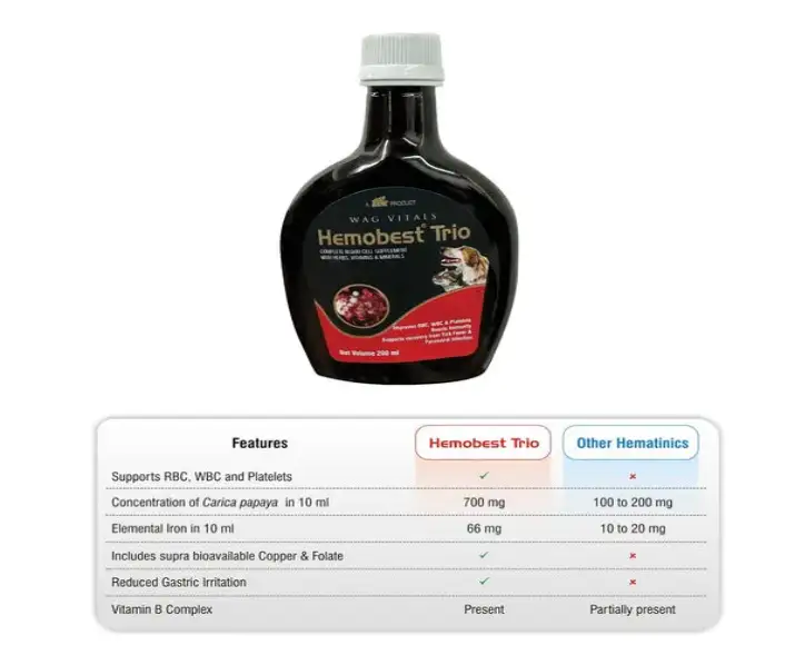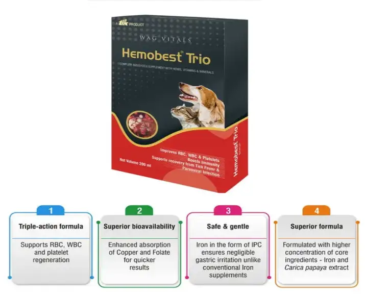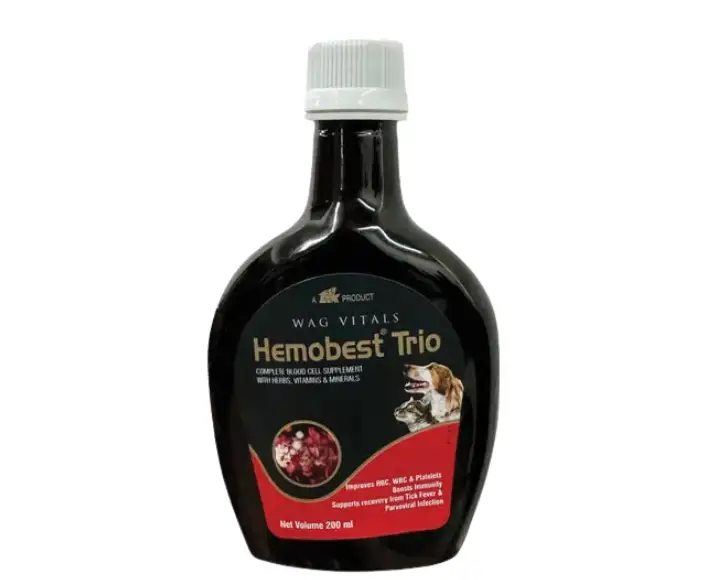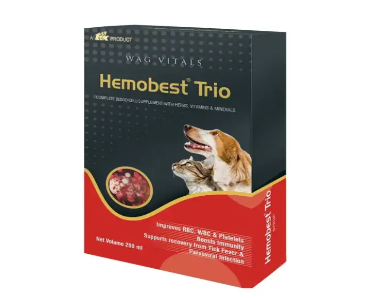 TTK Hemobest Trio is a highly trusted hematinic and nutritional supplement specially developed to support blood health, vitality, and overall wellness in dogs and cats, it is ideal for pets recovering from anemia, chronic weakness, parasitic infestations, post-surgery weakness, or poor appetite due to nutrient deficiencies, this TTK Hemobest Trio premium formulation combines essential vitamins, minerals, and supportive nutrients that aid healthy red blood cell formation, boost immunity, and improve energy levels, suitable for puppies, adult dogs, senior pets, kittens, and adult cats, TTK Hemobest Trio is gentle yet effective, making it a dependable daily supplement for improving your pet’s quality of life.