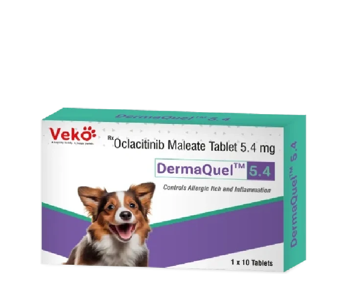 Veko DermaQuel 5.4 MG Oclacitinib Tablets are specially formulated to provide fast and effective relief from itching and allergic skin conditions in pets. Suitable for both dogs & cats, these Veko DermaQuel 5.4 MG Oclacitinib Tablets help manage symptoms of allergic dermatitis, including redness, irritation, and excessive scratching. Powered by oclacitinib, a clinically trusted active ingredient, this medication works by targeting the underlying cause of itching rather than just masking symptoms. Veko DermaQuel 5.4 MG Oclacitinib Tablets is ideal for pet parents seeking a reliable, vet-recommended solution to improve their pet’s skin health and overall comfort.