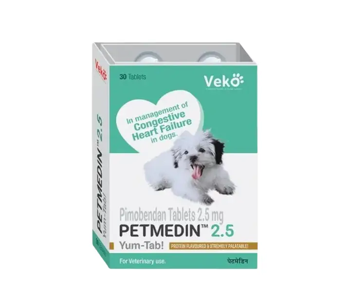 Veko Petmedin 2.5 MG (Pimobendan) Tablet is a trusted veterinary medicine designed to support dogs suffering from congestive heart failure (CHF) caused by dilated cardiomyopathy (DCM) or valvular disease, Veko Petmedin 2.5 MG (Pimobendan) Tablet specifically formulated for canine use, it enhances heart function, improves blood circulation, and helps dogs lead a more active and comfortable life, Veko Petmedin 2.5 MG (Pimobendan) Tablet recommended by veterinarians, this medicine is an essential part of managing chronic heart conditions in dogs.