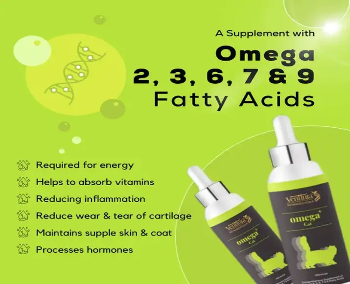Venttura Omega Plus Cat Supplement is a premium liquid nutritional supplement formulated to support healthy skin, a glossy coat, and overall skin comfort in cats of all breeds and life stages, Venttura Omega Plus Cat Supplement specially designed for feline needs, this supplement provides essential omega fatty acids that help nourish the skin from within and enhance coat quality naturally, cats can experience dry skin, dull fur, excessive shedding, or seasonal coat changes due to nutritional gaps, environmental stress, or age-related factors, Venttura Omega Plus Cat Supplement works as a daily dietary addition to help maintain skin hydration, improve coat softness, and support a healthy skin barrier, the palatable liquid form makes it easy to administer directly or mix with food, Venttura Omega Plus Cat Supplement ensuring stress-free supplementation for pet parents.