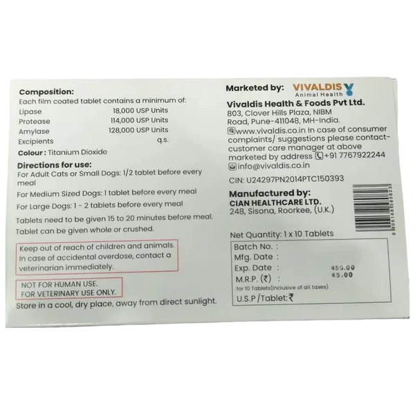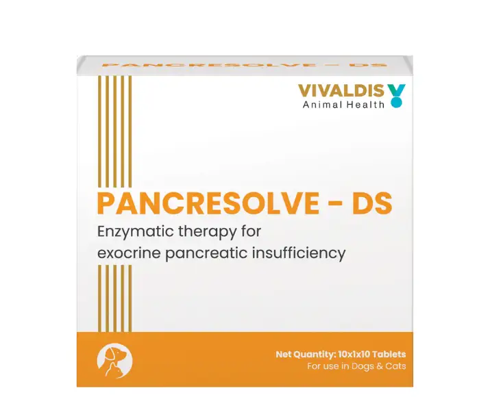Vivaldis Pancresolve DS Tablets are specially formulated digestive enzyme supplements for dogs & cats suffering from exocrine pancreatic insufficiency (EPI) and related digestive disorders, this Vivaldis Pancresolve DS Tablets advanced veterinary formulation helps pets efficiently digest fats, proteins, and carbohydrates, Vivaldis Pancresolve DS Tablets ensuring proper nutrient absorption and overall vitality, these Vivaldis Pancresolve DS Tablets are suitable for both dogs & cats of all breeds and sizes and are designed to alleviate symptoms such as bloating, gas, poor appetite, and weight loss caused by enzyme deficiency.