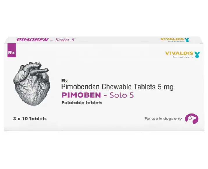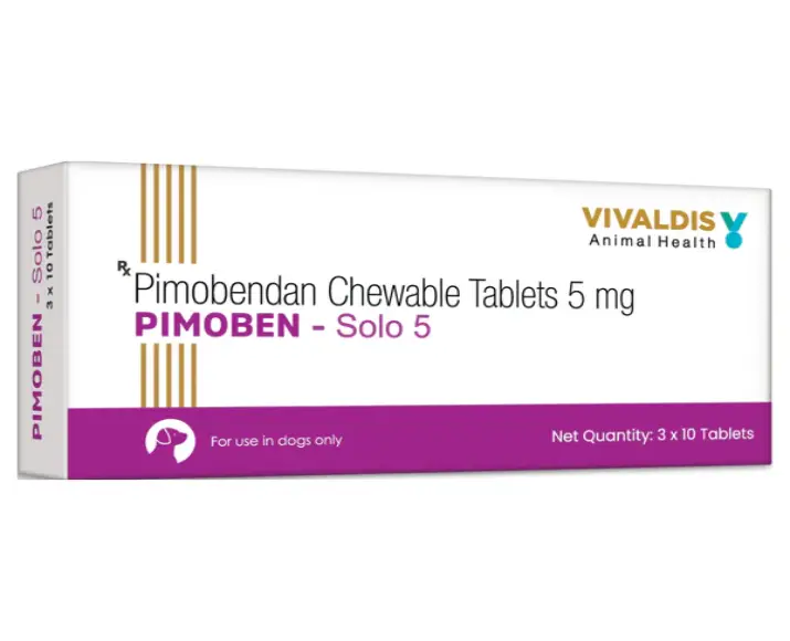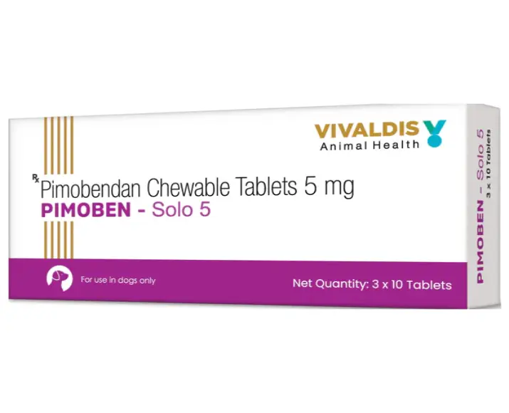 Vivaldis Pimoben Solo 5 MG (Pimobendan) Tablet for dogs is a trusted veterinary formulation designed to support dogs suffering from congestive heart failure and other heart-related conditions, Vivaldis Pimoben Solo 5 MG (Pimobendan) Tablet specially made for canine companions, this medicine works by improving heart muscle efficiency, promoting blood circulation, and enhancing the overall quality of life for dogs with cardiac issues, Vivaldis Pimoben Solo 5 MG (Pimobendan) Tablet veterinarians widely recommend it for its safety, effectiveness, and ease of administration.