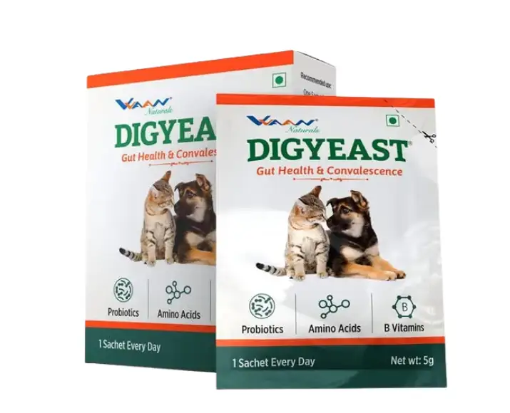 Vvaan Digyeast Pouch is a specially formulated digestive supplement designed for both dogs & cats. It contains beneficial probiotics and digestive enhancers that help maintain a healthy gut environment. ideal for pets experiencing digestive disturbances like diarrhea, indigestion, or poor appetite, this Vvaan Digyeast Pouch supplement supports overall digestive balance and nutrient absorption. The convenient sachet format ensures accurate dosing and easy administration, Vvaan Digyeast Pouch making it a reliable choice for pet parents seeking effective digestive care.