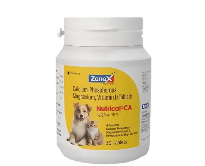 Zenex Nutrical CA Tablets are specially formulated calcium and mineral supplements designed to support the bone health, muscle function, and overall growth of dogs & cats, Zenex Nutrical CA Tablets ideal for puppies, kittens, adult pets, senior pets, lactating mothers, and pets recovering from deficiencies, these Zenex Nutrical CA Tablets ensure that your pet receives balanced nutrition every day, whether your pet is in its developing stages or needs additional support for mobility and bone strength, this Zenex Nutrical CA Tablets supplement provides reliable and effective nutritional care, packed with essential nutrients such as calcium, phosphorus, Vitamin D3, and vital minerals, Zenex Nutrical CA Tablets help prevent conditions related to calcium deficiency, delayed bone development, weak joints, and reduced mobility.